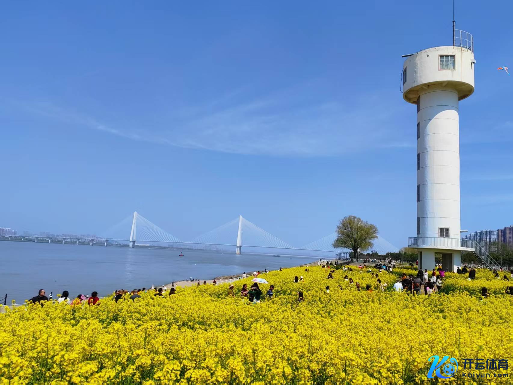 (武昌江滩白塔下的油菜花海,夏言言摄)