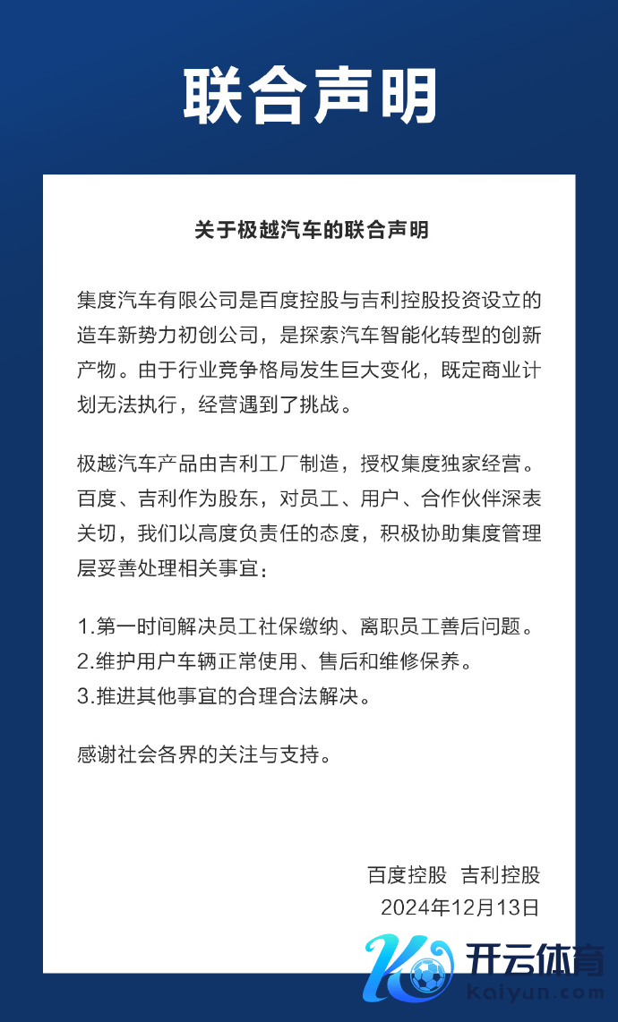 12月13日,祯温情百度发表对于极越汽车的聚合声明。声明称,算作股东,将积极协助集度不断层妥善处理有关事宜:第一技艺惩处职工社保交纳、辞职职工补偿问题;珍藏用户车辆常常使用、售后和维修难得;鞭策其他事宜的合理正当惩处。
