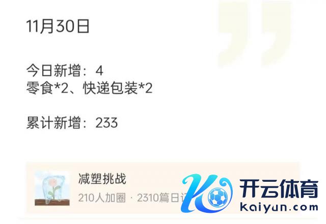 为了深切了解日常生存中塑料垃圾的起头,进而减少无谓要的塑料使用量,剪辑部里面发起了一个存眷并纪录逐日的塑料消费情况的行径。一个月后,共事得到的谜底是:233。