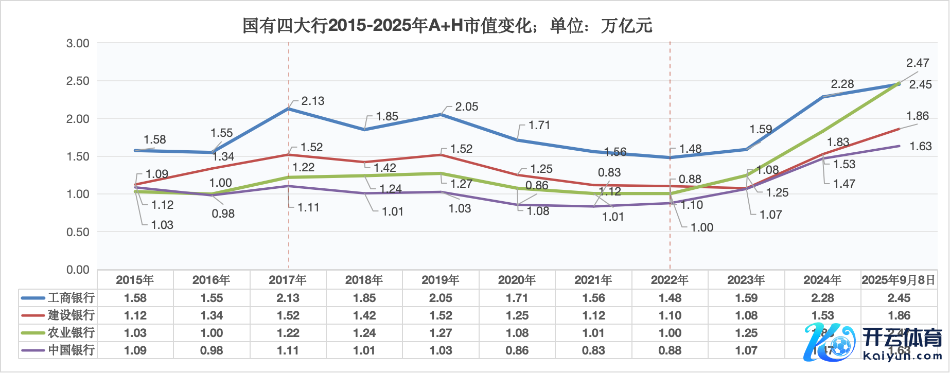 后续农行市值增长抓续提速,分别在2025年8月6日、9月4日,完成了对工行A股教授市值与A+H总市值的高出,成为人人市值最大银行。