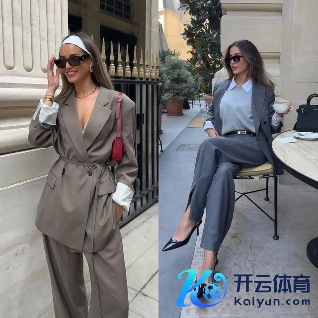 颜料上提议西装和裤子选同色系粗略临近色彩,比如灰色西装置深灰阔腿裤、米色西装置卡其色阔腿裤,高下颜料衔尾顺畅,腿的线条从腰一直蔓延到脚踝,显高效力特别昭彰,上班穿这一套,大方多礼还很闲逸。